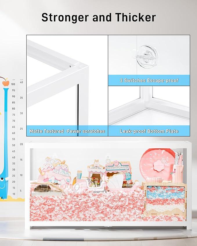 - 【Chew-proof & Sturdy Hamster Tank】Made with thickened clear acrylic panels and a chew-proof metal frame, this dwarf hamster cage is perfect for keeping your little escape artist safe. Four clear-view windows allow you to easily spot your pet at any time.