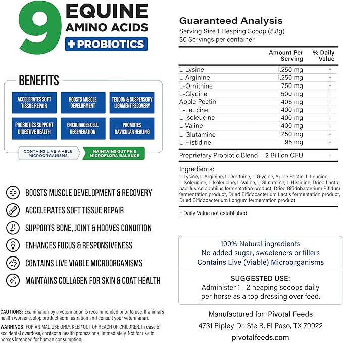 Pivotal Power+ Horse Supplement (174g/0.38lbs - 30 Servings) - 9 Equine Amino Acids Plus Probiotics for Horses - No Added Sugar, No Soy, No Fillers - Horse Joint Support Supplement, White