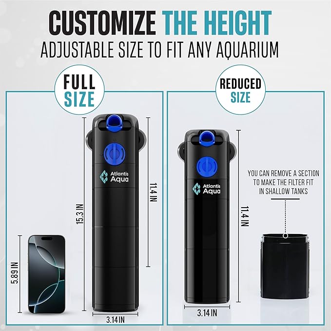 - ALL-IN-ONE FILTRATION SYSTEM – Our submersible fish tank filter includes a sponge filter and a biological filter. The filter is 15.3" tall and 3.14" wide but it can be used with one section removed and is 11.4" tall.