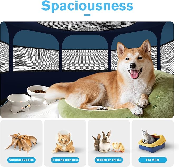 - Outstanding structure: The spacious 8-panel design features protected seams and reinforced corners. The removable zippered top has a half-mesh, half-shade design, and the double-zipper door comes with Velcro for easy pet access. The side pockets of the portable pet playpen are perfect for storing pet toys and water bottles.