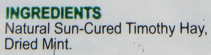 - Long strand timothy hay plus spearmint to provide a variety of textures and flavors for added enrichment