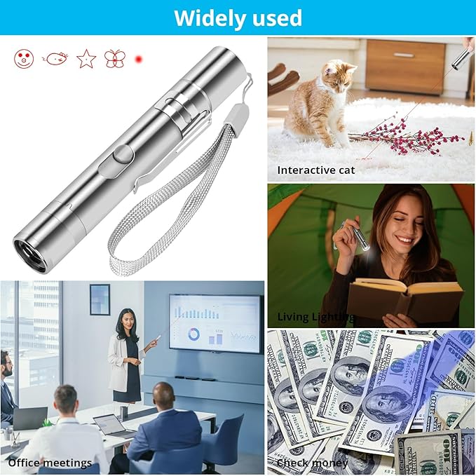 - 【Multiple Function】The cat wand toy is versatile. It can also be used as a pointer for presentations, with a bright beam for clear visibility. You can turn it on with a single push, no need to hold down the button. The lighting mode can glow in the dark, and the purple mode can detect counterfeit money.