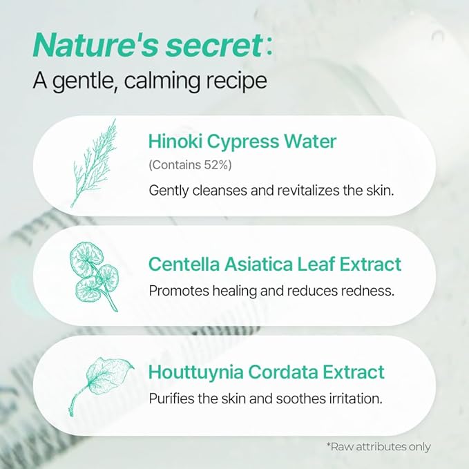 - Soothes & Calms: 53% Hinoki Cypress Water provides a soothing effect, relieving itching and discomfort.