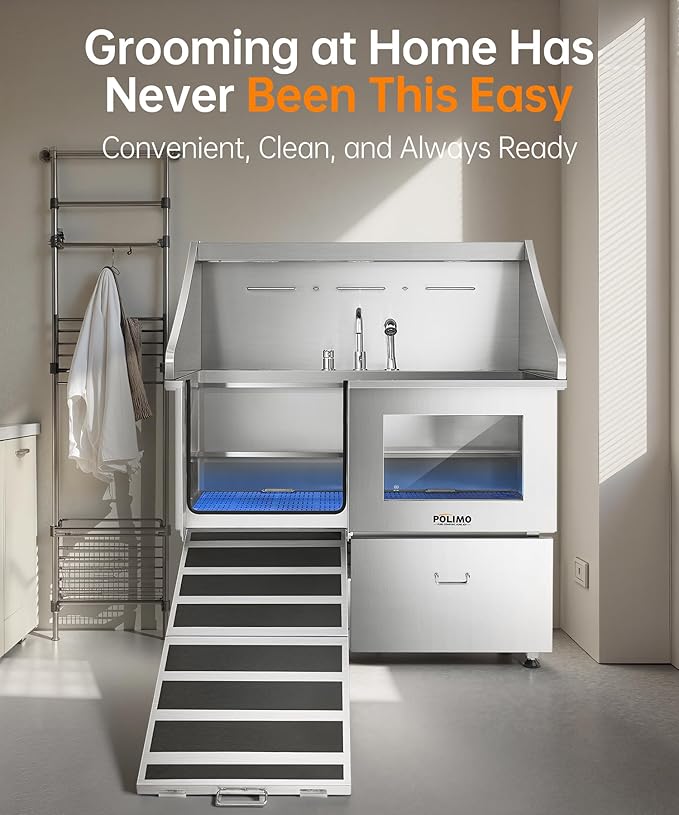 - Innovative and Practical Design: The POLIMO dog grooming station features multiple outstanding design elements: โ IP65 Waterproof high-brightness LED spotlight. โก Grade A tempered glass observation window. โข The bathtubโs side panels feature a curved slide design, making it easier to operateโฃ Two-piece floor grid, adjustable to three different heights. โค Sliding storage drawer for organized storage. โฅ Multi-function faucet and showerhead, adjustable to left, center, or right positions.โฆ Two drainage options are available: one with a pet hair catcher and another stainless steel drain pipe featuring an odor-blocking S-trap design
