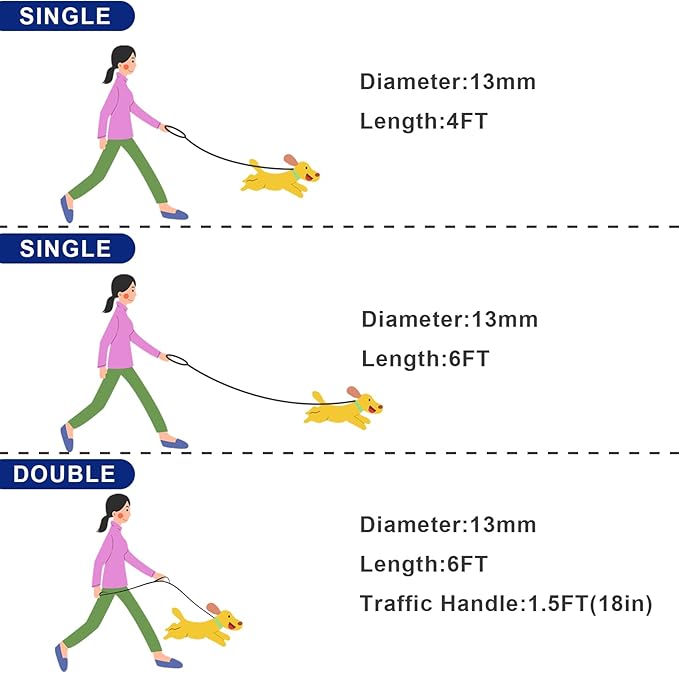 - 【Double Handle】Dog Leash with traffic handle gives you more control over your dog, and guide it through busy and crowded areas with ease. It offers an extra level of safety for your furry friends in an emergency situation. Our 6ft standard dog leash handle is great for walking, running, hiking or training, and is a perfect balance between freedom and control.