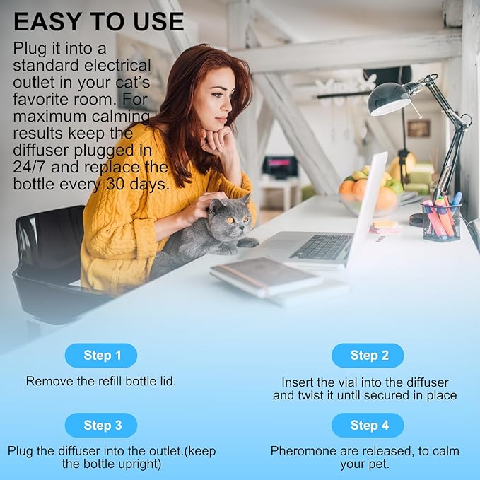- 【EFFECTIVE CALMING FOR CATS】The Cat Calming Diffuser is a powerful tool designed to alleviate anxiety relief for cats. Its enhanced formula releases pheromones that mimic the natural calming scents produced by mother cats, providing a sense of security and relaxation for your furry friend.
