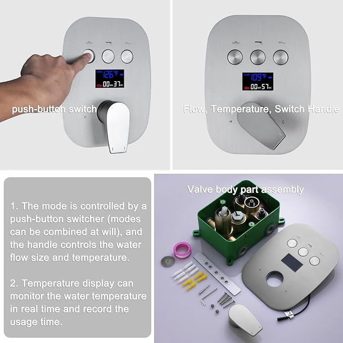 - Temperature digital display(no power or battery required): rain shower system design update, shower valve uses a hydro generator, built-in LCD digital temperature display(ยฐF), easy to monitor temperature