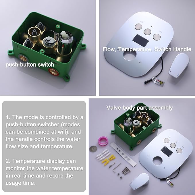 - Temperature digital display(no power or battery required): rain shower system design update, shower valve uses a hydro generator, built-in LCD digital temperature display(°F), easy to monitor temperature