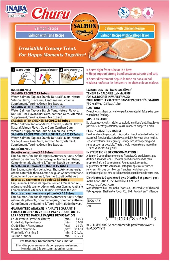 INABA Salmon Churu Cat Treats, Lickable, Squeezable Creamy Purée Cat Treat with Green Tea Extract & Taurine, 0.5 Ounces Each Tube, 60 Tubes, Salmon Variety Box