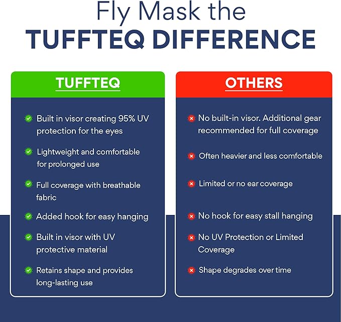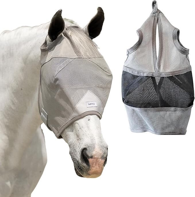 - ๐๐ฎ๐ข๐ฅ๐ญ-๐๐ง ๐๐ข๐ฌ๐จ๐ซ ๐๐จ๐ซ ๐๐ง๐ก๐๐ง๐๐๐ ๐๐ ๐๐ซ๐จ๐ญ๐๐๐ญ๐ข๐จ๐ง: The TUFFTEQ Horse Fly Mask Without Ears Plus Size features a built-in visor designed to block harmful UV rays. This provides extra shade and reduces glare, offering enhanced protection for your horseโs eyes and face during long hours outdoors.