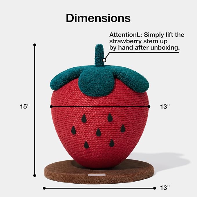 - 【Indoor Cats Toy】The cat scratching height measures 15", the base measures 13" in diameter, strawberry diameter measures 13".The reinforced base ensures stability, preventing any risk of wobbling or tipping over. The surface is wrapped with delicate and soft plush, providing a soft touch and ensuring a happy and safe playtime for your cat