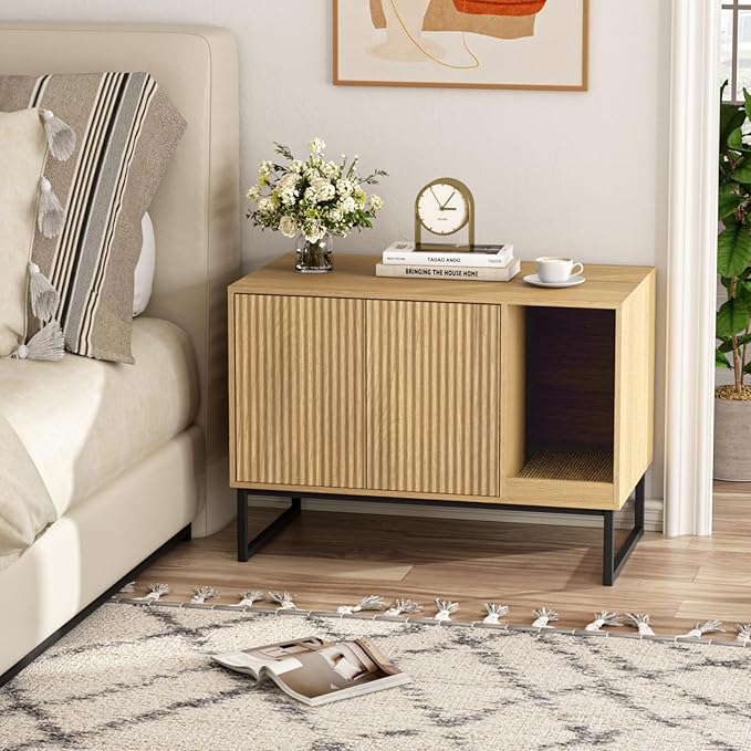 - Elegant Flute Wave Design: The cat litter box furniture features a unique wave-shaped fluted door that brings visual interest while reflecting texture and elegance. For pets, it can be used as a litter box enclosure, cat house, cat play place, etc. For home furniture, it can also use it as a side table, TV stand, bedside table, bench, etc. Multifunctional cat cabinet furniture for you and kitties