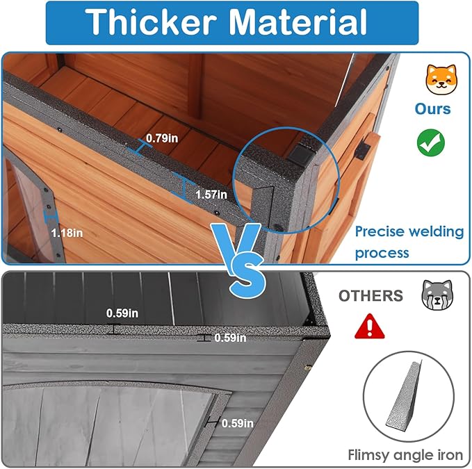 - Sturdy Construction: This is outdoor dog house with STRONG metal frame to extend its service life. The waterproof base is elevated off ground. The roof is slanted so rainfall will not sit on top