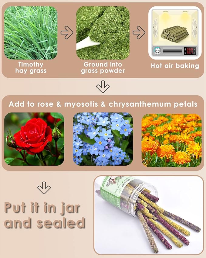 - 4 in 1 Rabbit Treats: 38PCS 3 flavors of the mixed bunny chews set includes Rose, Myosotis, Dahlberg daisy sticks and 38PCS Timothy hay sticks are made of 100% natural organic timothy hay to provide daily energy and fiber. Quality and intriguing select of bunny toys and treats set for your small friends!