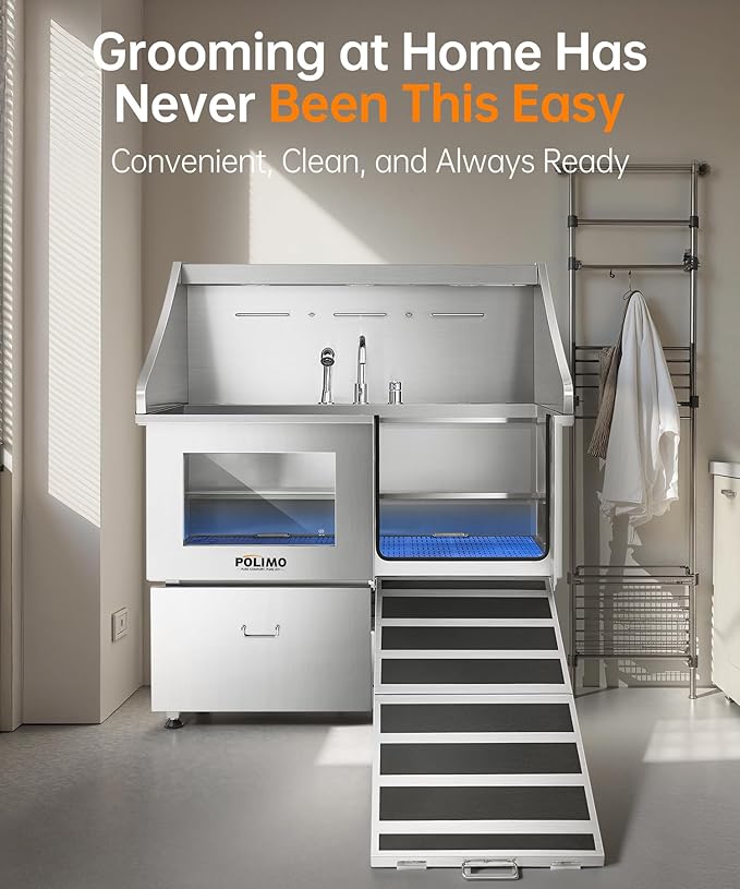 - Innovative and Practical Design: The POLIMO dog grooming station features multiple outstanding design elements: โ IP65 Waterproof high-brightness LED spotlight. โก Grade A tempered glass observation window. โข The bathtubโs side panels feature a curved slide design, making it easier to operateโฃ Two-piece floor grid, adjustable to three different heights. โค Sliding storage drawer for organized storage. โฅ Multi-function faucet and showerhead, adjustable to left, center, or right positions.โฆ Two drainage options are available: one with a pet hair catcher and another stainless steel drain pipe featuring an odor-blocking S-trap design