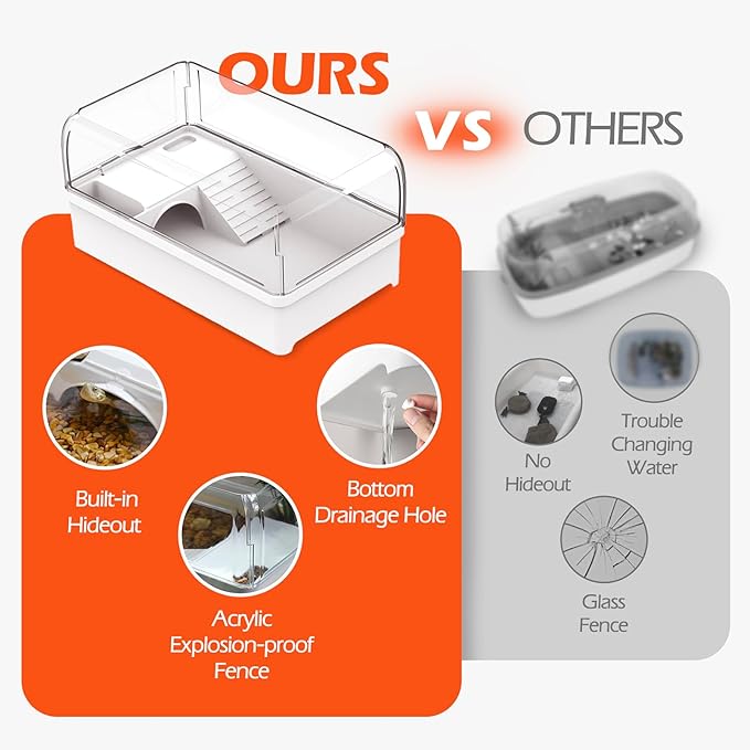 - Anti-Escape Arc Fence & 360° View: Our turtle tank has a raised curved fence to prevent escapes.Made of four 4.88-inch clear acrylic panels for a 360° view of your turtles' activities.Your pets are safe, but also delighting in their daily behaviors