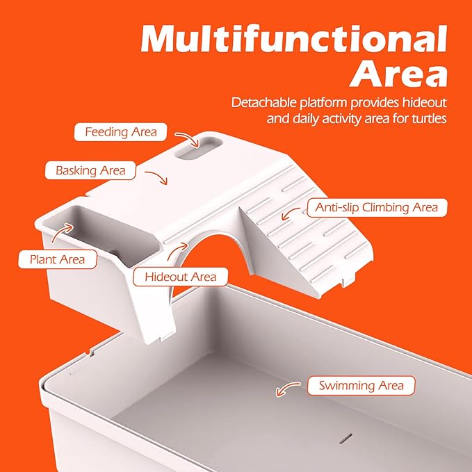 - Upgraded Turtle Tank Kit with Built-in Hideout: Elevate your turtle care with our newly upgraded tank, featuring an integrated hideout area. This shelter provides a safe and comfortable space for your tortoise to acclimate to new surroundings
