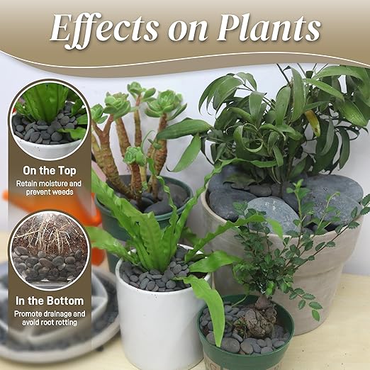- 【Benefits for Plants】Covering pots with river stones enhances plant aesthetics, regulates soil moisture, and prevents weeds. Placing river pebbles at the bottom of pots promotes drainage and prevents root rot.