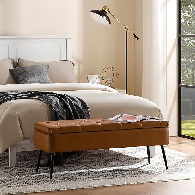 - MULTIPLE OCCASION USE: The storage ottoman bench can be placed at the end of your bedroom bed for storing blankets clothing and pillows, or used as a shoe bench in the hallway, stylish extra seating in the closet, etc.this leather bed bench is perfect to meet your diversified matches and needs.