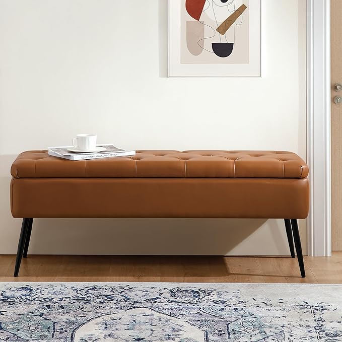 Leather Storage Ottoman Bench,End of Bed Bench for Living Room Bedroom Dinning Room Entryway,Mid-Century Modern,Faux Leather,with Steel Legs,Safety Hinges, Loads 660 lb (with Button, Brown)