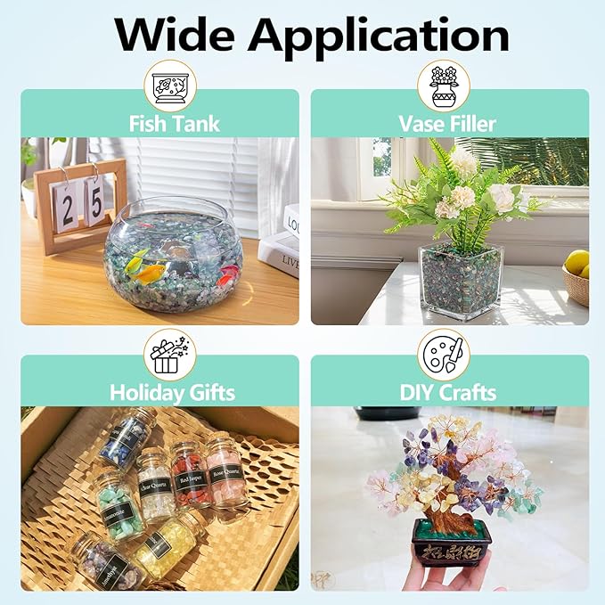 - Feature: Green crushed crystal is 5-7mm (0.2"-0.27"), 3 Lb/Box. Green agate chips are made from high-quality natural blue agate crystals, carefully processed into irregular shapes to create a unique and eye-catching look. (Please clean agate before use to bring out the dazzling color of the stone)