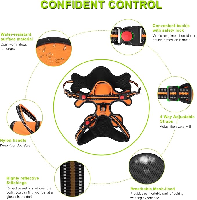- 【 No Pull & Choke-Free Design 】Designed with your dog's comfort in mind, our No Pull Dog Harness is structured to distribute pressure evenly throughout your dog's body, preventing choking and discomfort during walks. This feature offers a more humane and safe way for you to control your dog.