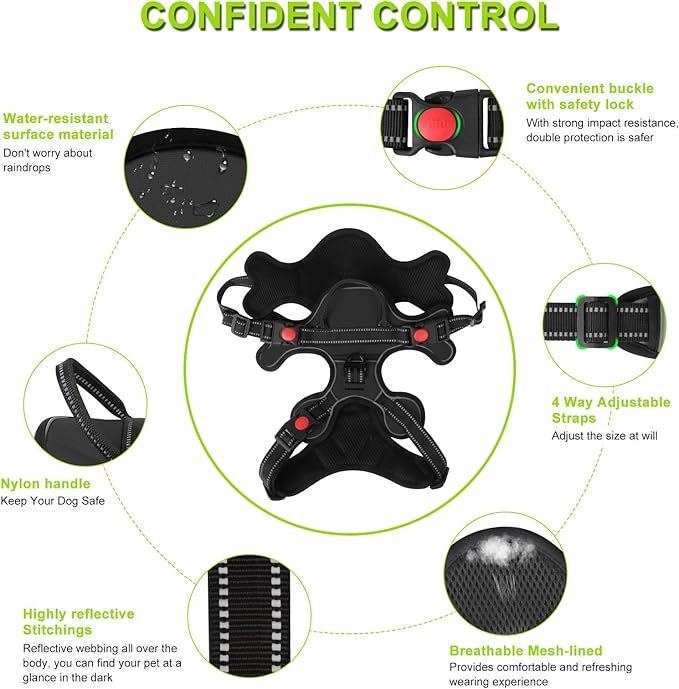 - 【 No Pull & Choke-Free Design 】Designed with your dog's comfort in mind, our No Pull Dog Harness is structured to distribute pressure evenly throughout your dog's body, preventing choking and discomfort during walks. This feature offers a more humane and safe way for you to control your dog.
