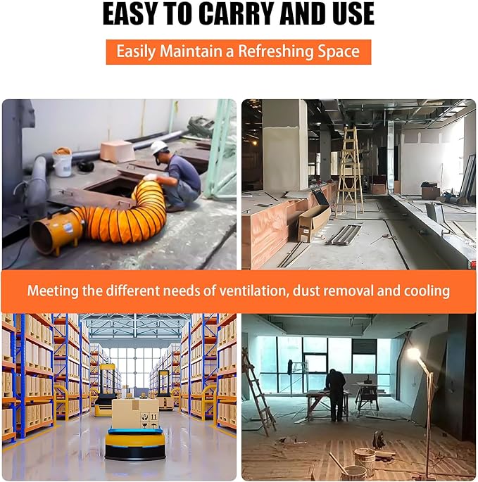 - Reliable Construction and Versatile Design: Built with a solid metal structure, this fan features a convenient carry handle for easy transport. Non-slip rubber feet minimize vibrations and ensure quiet operation. Perfect for a wide range of settings, including factories, basements, shipyards, farms, grain storage, warehouses, kitchens, offices, workshops, tunnels, automotive production, and other areas needing efficient ventilation.