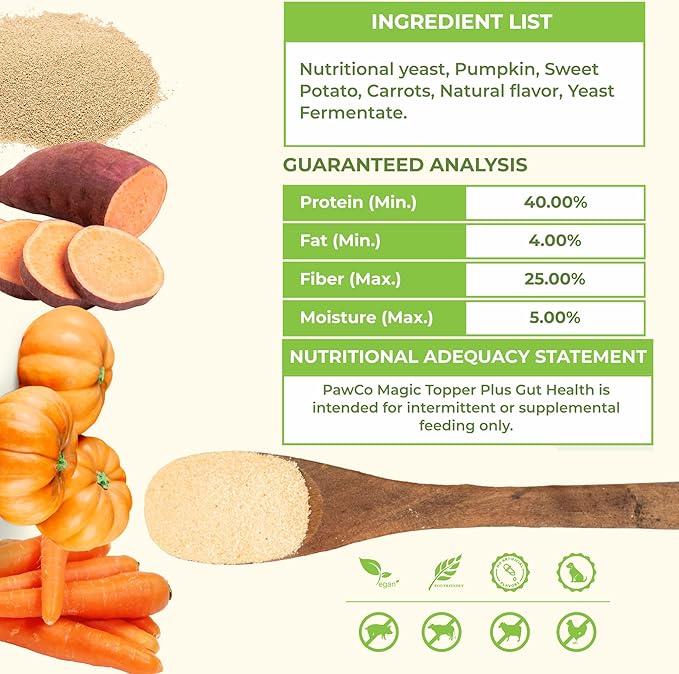 - Grain-Free & Vegan: A grain free topper made with natural, plant-based ingredients, perfect for sensitive stomachs.