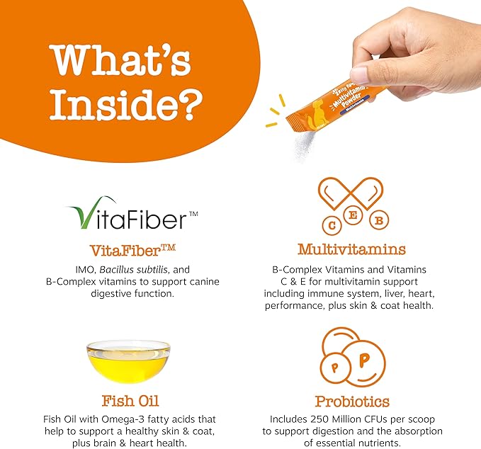 - Real Ingredients, Real Results - Each dog supplements vitamin for dogs serving includes premium VitaFiber IMO (dog fiber supplements), omega fatty acids from fish oil (EPA and DHA), and the combination of Vitamin C (Ascorbic Acid), E, B12, Biotin, and more.