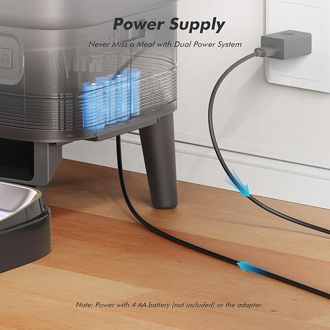- Dual Power Supply: Powered by either a Type-C adapter or 4 AA batteries (not included), this automatic feeder keeps meals coming even during power outagesโso your pet never goes hungry. It also includes a durable, chew-resistant 1.5-meter nylon cable for flexible and worry-free placement.