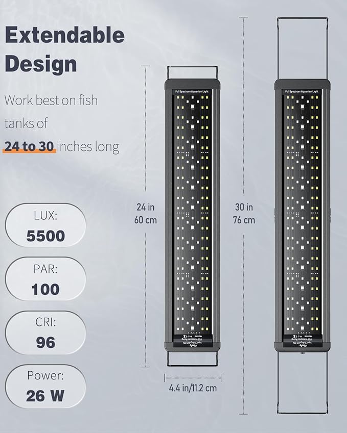 • For 24" to 30" Tanks: With an extendable bracket (min length: up to 24"; max length: up to 30"), the LED aquarium light always stays steady on the fish tank. Work best on tanks of 24 to 30 inches long.