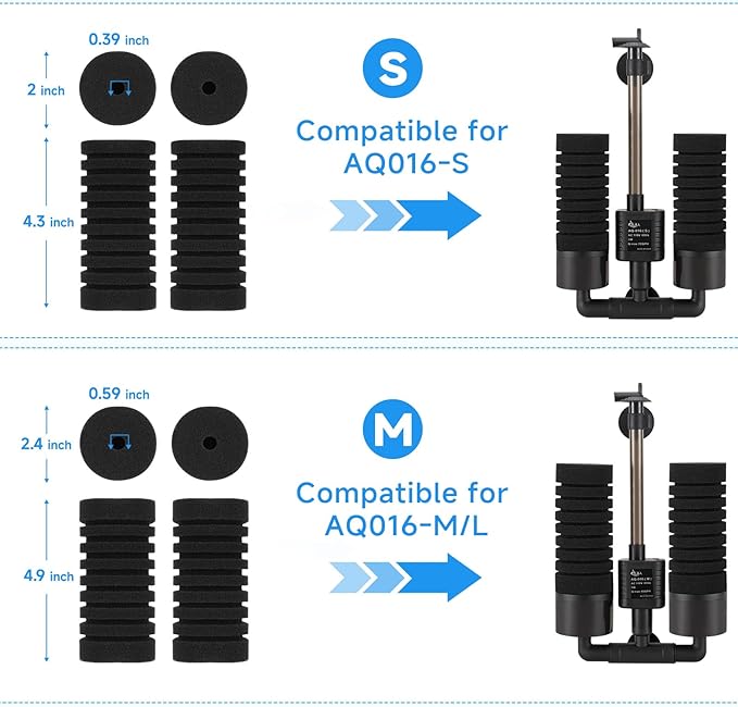 - Fits AQQA Powered Aquarium Sponge Filter (AQ016): Size Small will fit AQ016-S, Size Medium will fit AQ016-L