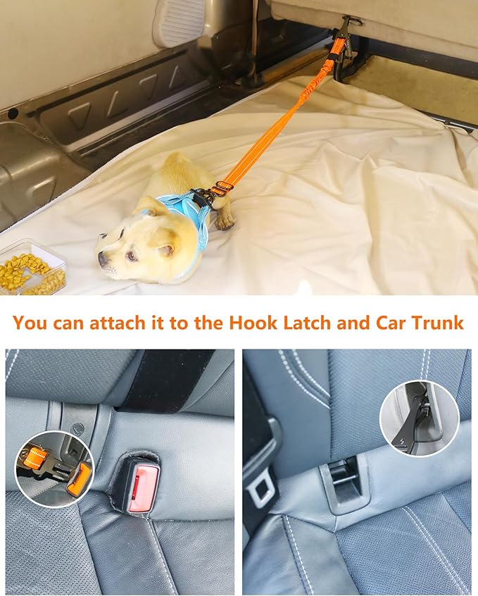 AUBELL Dog Seat Belt for Car,2 Pack Set 3-in-1 Adjustable Reflective Bungee Heavy Duty Dog Car Harness Tether with Clip Hook Latch & Buckle,Swivel Zinc Alloy Carabiner,Black+Orange