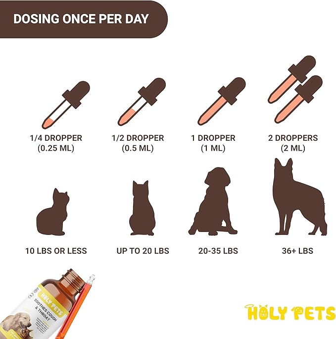- SIMPLE AND CONVENIENT DOSAGE: Just add to your pet’s food or water once or twice daily. For small pets (up to 20 lbs), use ½ drop; for pets between 20-35 lbs, use 1 drop; for larger pets (36 lbs and up), use 2 drops. The liquid formula is tasteless, free of chemicals, and easy to administer, making it a great alternative to pills, syrups, or chewables