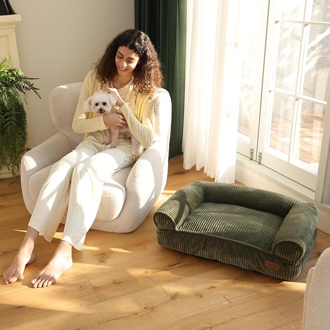 FUKUMARU Dog Couch Bed, Corduroy Cozy Cat Bed for Indoor Cats with Washable Cover, Supportive Waterproof Dog Beds Sofa for Small Dogs and Large Cats Cute, 28inch, Medium, Green
