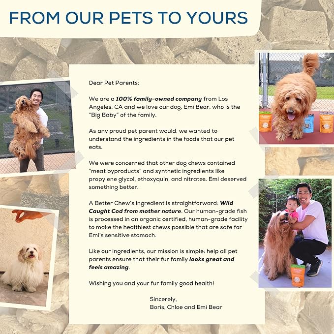 • SUSTAINABLY SOURCED AND MADE IN THE USA: Our chews are sustainably sourced, wild caught and human grade. Our mission is to ensure only the freshest, healthiest, and best quality ingredients to make A BETTER CHEW - from the makers of A BETTER TREAT.