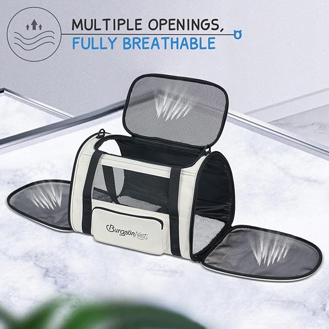 - Well-made Large Cat Carrier: With upgraded memory metal for sturdy frame, this cat carrier for 2 cats does not collapse. Made of breathable fabric, BurgeonNest cat carrier has 3 doors to open, it is more convenient to put your dog cat in or out. Plush cushion with sturdy bottom inserts ensures comfortable environment for pets.