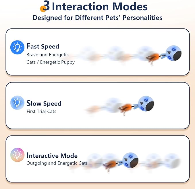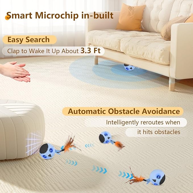 - 🐥CAT AFTER MOUSE GAME: Interactive cat toys ball with a teaser feather tail is shaken or swung in front of the cat, imitate the random movement of small animals, emit sounds and LED flashing attract cats' attention, prompting cats to chase, jump and run. let cats experience a "natural" game, enhance the sense of reality and satisfaction. Through fast and random movements, helping cats consume excess energy and stay energetic and healthy.