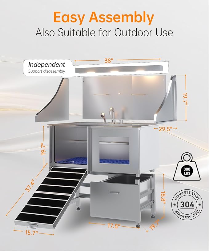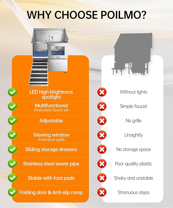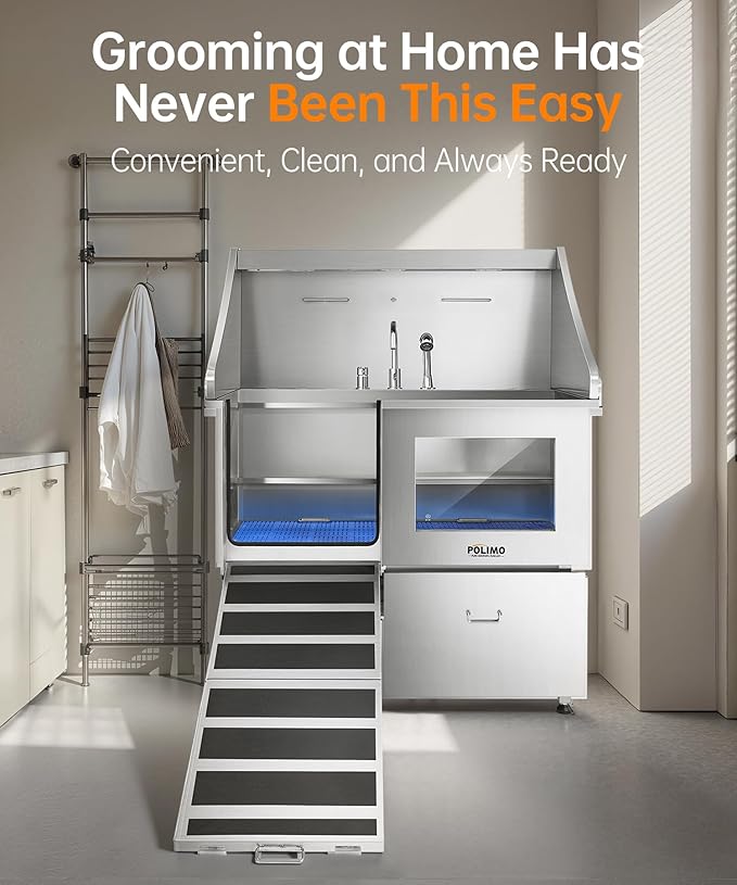 - Innovative and Practical Design: The POLIMO dog grooming station features multiple outstanding design elements: โ IP65 Waterproof high-brightness LED spotlight. โก Grade A tempered glass observation window. โข The bathtubโs side panels feature a curved slide design, making it easier to operateโฃ Two-piece floor grid, adjustable to three different heights. โค Sliding storage drawer for organized storage. โฅ Multi-function faucet and showerhead, adjustable to left, center, or right positions.โฆ Two drainage options are available: one with a pet hair catcher and another stainless steel drain pipe featuring an odor-blocking S-trap design