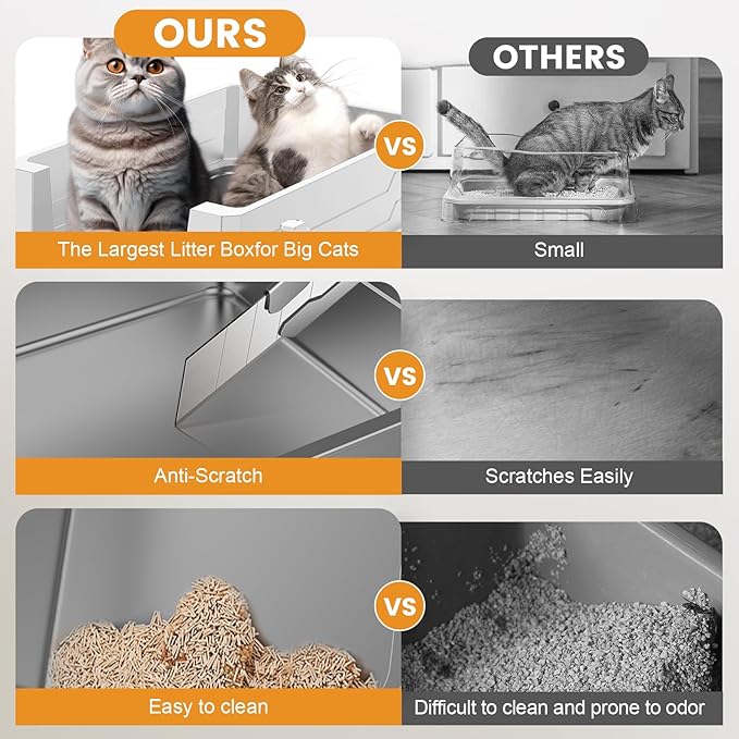 - Anti-leakage: The cat litter box adopts a leak-proof design, including a sealed bottom and curved shape. Excellent sealing - ensure that the liquid is controlled in the stainless steel cat litter box, keeping your home clean and odor-free.
