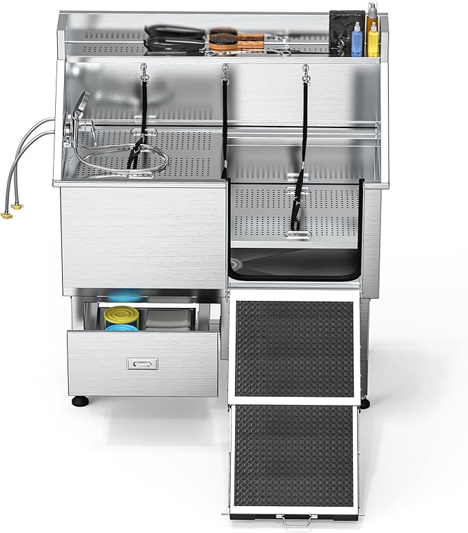 - Spacious Storage: Our pet bathing station's twin-drawer design expands storage capacity, each drawer supporting up to 22lb; The extended top shelf allows easy tool access, helping keep your grooming area tidy