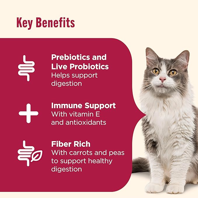 - HEALTHY DIGESTION: Cat food made with prebiotics and live probiotics plus fiber rich peas and carrots to proactively support healthy digestion