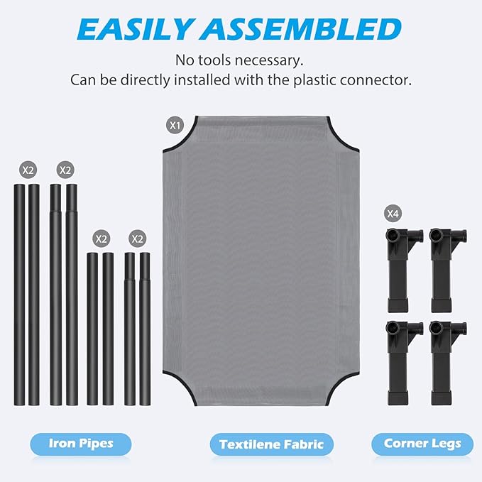 - Easy to Install: The cooling dog cot can be installed without the use of any tools, screws and can be installed directly with the plastic connector. It only takes a few minutes of your time, and presto. It's up and ready for your pet to enjoy in. Perfect for any indoor space or outdoor adventure.