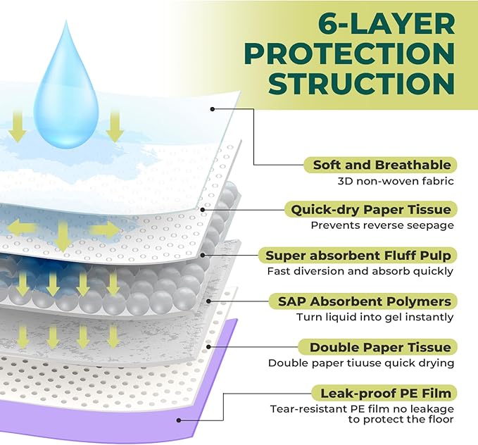 - Super Absorbent & Leak-Proof Design: Our cat pads feature a 6-layer construction with a super absorbent SAP core that absorbs up to 15 cups of urine. Each pad can last for 2-3 days for two cats, keeping your litter box dry and clean. The leak-proof bottom, made from durable PE film, ensures no spills or tears, preventing liquid from seeping out and keeping your home fresh