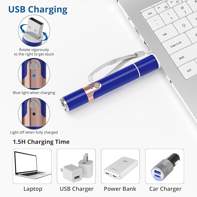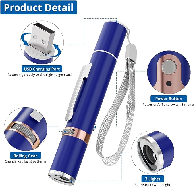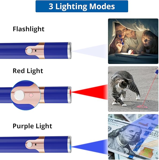 - Multiple Function: The cat toy can also make you a presenter. It is very bright. Plus, you can turn on the switch with a single press. White mode can glow in the dark; Purple mode can detect money.