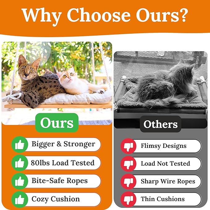 - Strong & Sturdy Frame: Built with a solid pine wood board and thick cotton ropes, and enhanced with 5 strong suction cups capable of supporting up to 80 lbs, our cat window seat guarantees durability and a security while your feline friend enjoys the view.