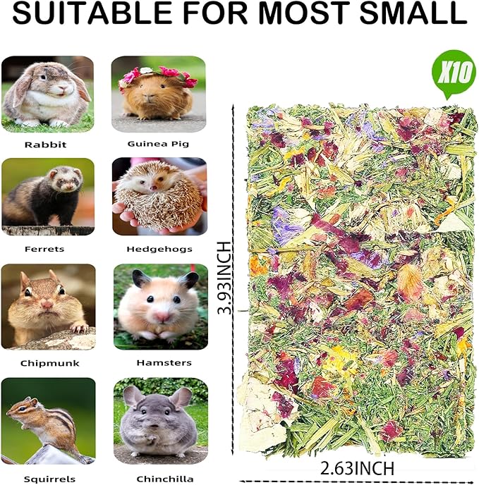 - [10 Packs Individually Vacuum-Packed] Thimothy chips, 4inch (L) 2.6inch (W) 0.2inch(H) Each piece of our bunny toy is vacuum compressed and packed for easy storage, clean and hygienic, no mould and easy feeding. You can take this guinea pig food and interact with your pet in a friendly way.Organic rabbit chew toys made from natural timothy hay, baked, shaped and sterilized by high temperature.