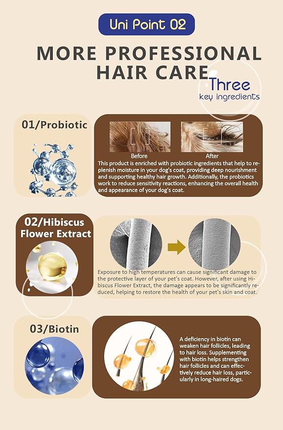 - โจ Say Goodbye to Post-Bath Chaos -- No more mats, breakage, or frizz. Biotin, coconut oil, and hibiscus work together to smooth the coat and strengthen strands, reducing shedding and tangling stress.