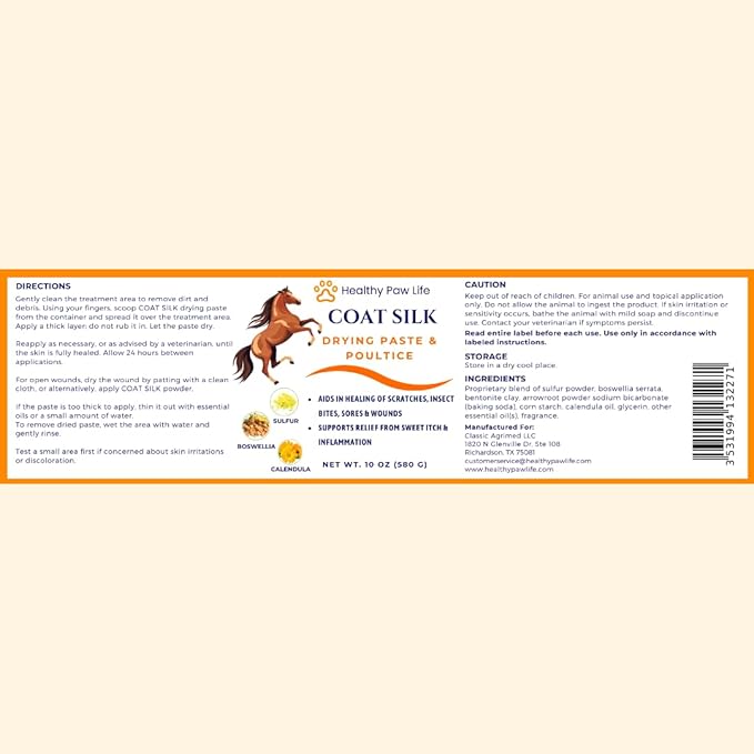 Coat Silk Drying Paste & Poultice for Horses – Natural Relief for Wounds, Scratches, Sores & Sweet Itch – Enriched with Sulfur, Boswellia & Calendula – 10 oz